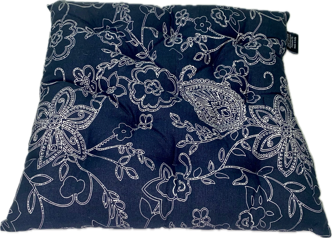 Sturdy and comfortable chair pad in navy with white paisley print.